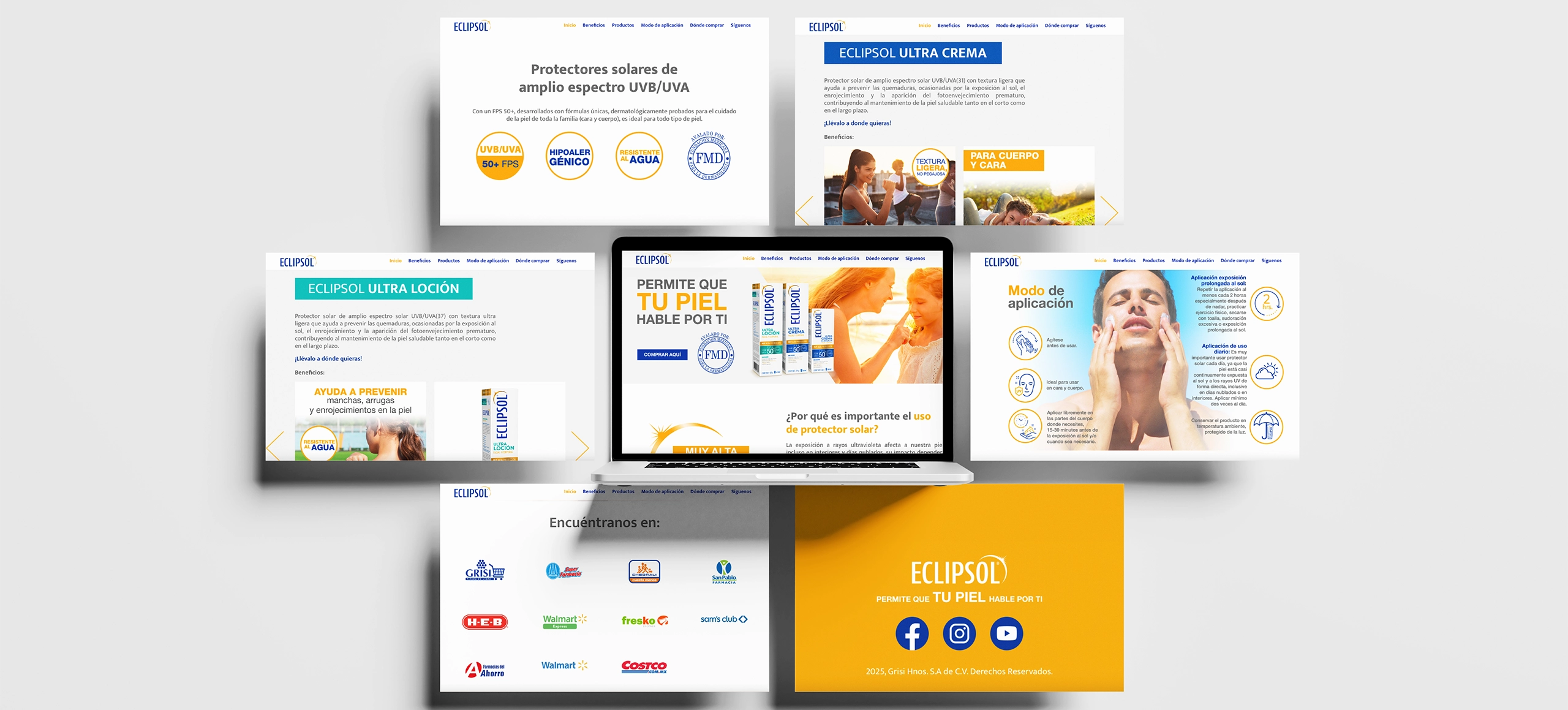 Para Eclipsol, Injerto desarrolló el sistema visual aplicado al packaging en sus líneas para adultos y kids, estableciendo una base clara y consistente para la marca. A partir de este sistema, diseñamos su sitio web y materiales POP para asegurar coherencia en todos sus puntos de contacto.
